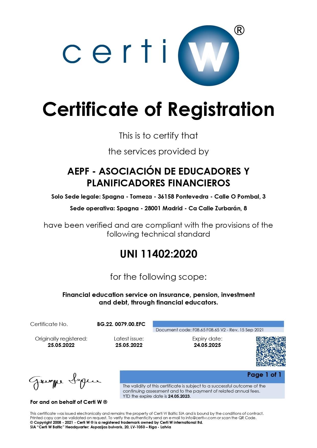 Periódicamente AEPF, los educadores financieros y las herramientas utilizadas son revisados por una auditoria externa independiente que garantiza la máxima fiabilidad, rigurosidad y coherencia con las normas técnicas. (Foto: certificado auditoria en vigor).